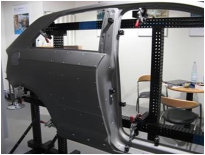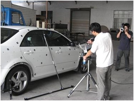由于攝影測量系統(tǒng)得到的是離散孤立圓點(diǎn)的坐標(biāo),為了得到大型物體(如汽車油泥模型)的完整點(diǎn)云,通常與3DSS三維掃描儀配合使用,以輕松得到物體的高精度點(diǎn)云。在這里,攝影測量系統(tǒng)的作用是得到物體的整體框架,3DSS分塊掃描得到物體的局部點(diǎn)云,并且通過框架點(diǎn)自動(dòng)拼接起來。